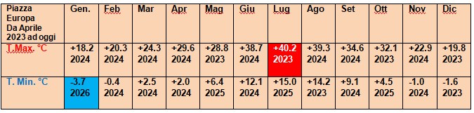 Temperature massime e minime assolute mensili registrate dal 19 Aprile 2023 ad oggi.
